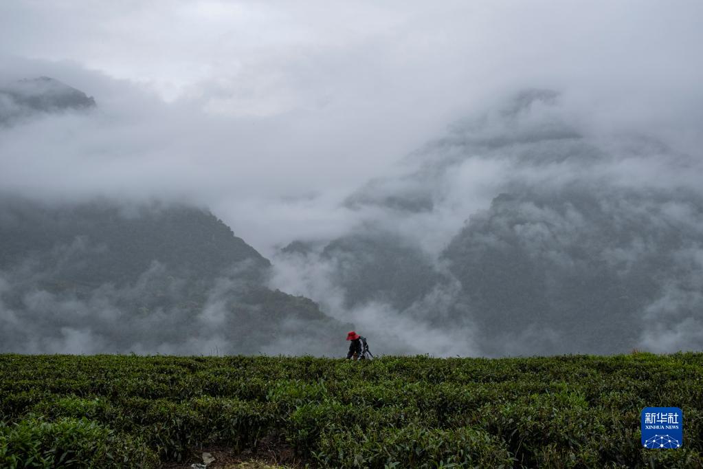 門巴族姑娘貢桑拉姆正在云霧繚繞的茶園里采摘茶青