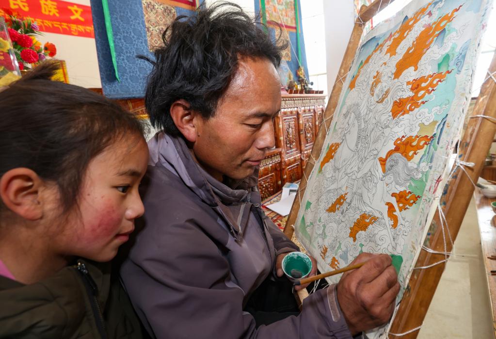 嘎桑堅(jiān)參所在的堤無(wú)瑪藝術(shù)傳承專業(yè)合作社由桑珠榮亞中村村民、西藏一級(jí)唐卡畫(huà)師西繞尼瑪創(chuàng)立。據(jù)介紹,目前合作社有25名員工,員工日工資最高超過(guò)200元。