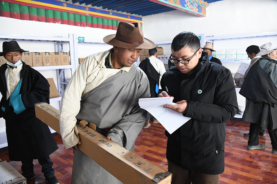 日喀則市昂仁縣多白鄉(xiāng)多白村村民在國(guó)家電網(wǎng)在藏首個(gè)“電力愛(ài)心超市”用積分兌換物品(3月30日攝)。國(guó)網(wǎng)西藏電力供圖 索娜央金 攝