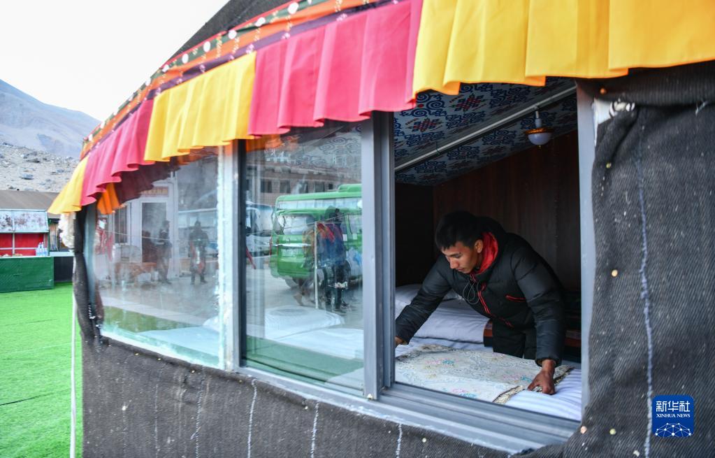 在珠峰游客大本營的帳篷旅館,扎西次仁在整理床鋪(5月13日攝)。新華社記者 晉美多吉 攝