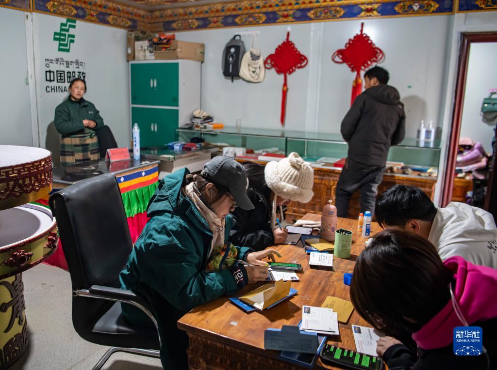 在珠峰游客大本營的郵政所,游客在寫明信片(5月13日攝)。新華社記者 孫非 攝