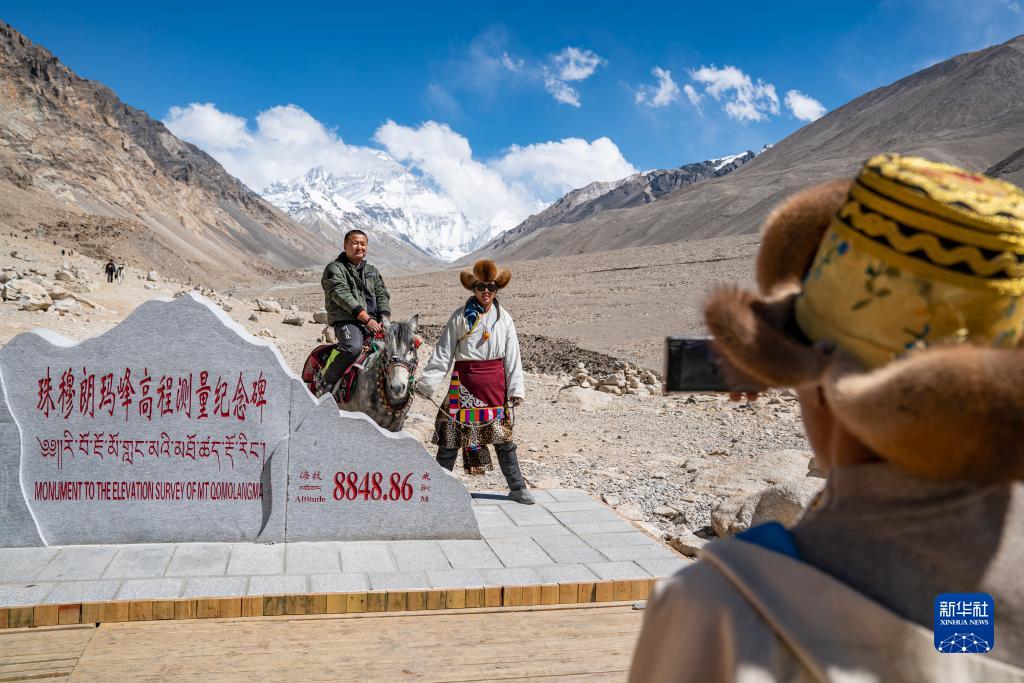 在珠峰大本營的珠峰高程測量紀念碑前,游客拍照留念(5月20日攝)。新華社記者 孫非 攝