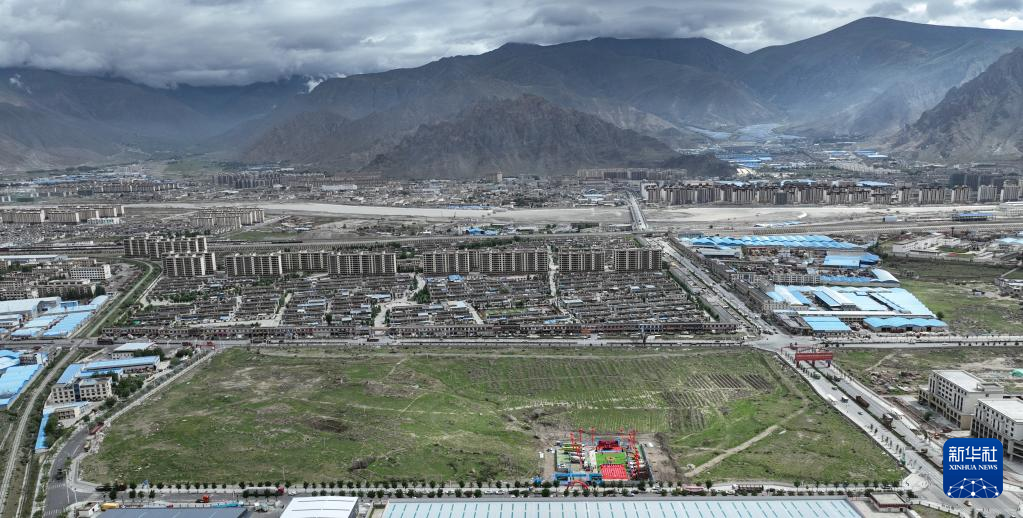 7月5日拍攝的拉薩市年產(chǎn)30萬噸啤酒建設(shè)項目奠基儀式現(xiàn)場(無人機(jī)照片)。新華社記者 晉美多吉 攝