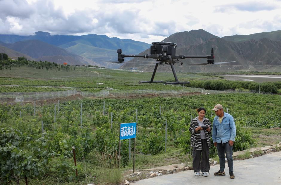 7月26日,桑日縣一家葡萄酒企業(yè)的員工曲珍(左)在葡萄園里向技術(shù)員何志榮學習使用農(nóng)用無人機。[詳細]