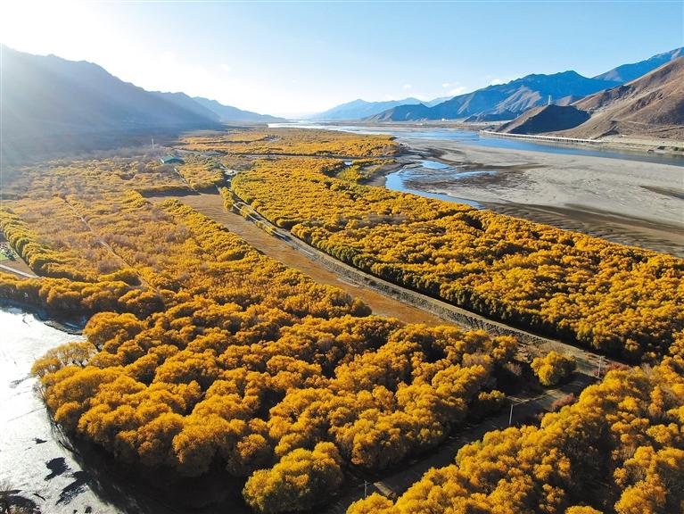 圖為初冬時(shí)節(jié),落日余暉下的雅魯藏布江河谷防護(hù)林。記者 丹增平措 武沛濤 攝