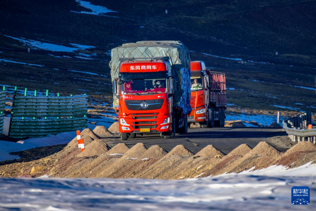 運(yùn)載著申扎縣供銷合作社為偏遠(yuǎn)鄉(xiāng)鎮(zhèn)果蔬配送試點(diǎn)項(xiàng)目從西寧采購(gòu)的50噸新鮮果蔬的貨車經(jīng)過唐古拉山口(1月3日攝)。新華社記者 曹檳 攝