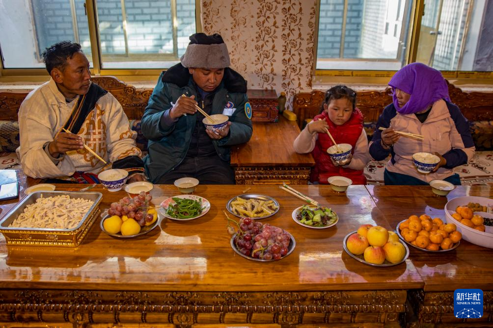 申扎縣馬躍鄉(xiāng)貝嘎四村村民次仁曲達(dá)(左一)家在吃飯,桌上的新鮮蔬菜和水果都是在村里的偏遠(yuǎn)鄉(xiāng)鎮(zhèn)果蔬配送試點(diǎn)項(xiàng)目直銷點(diǎn)采購(gòu)的,由供銷合作社當(dāng)天配送而來(1月5日攝)。新華社記者 姜帆 攝