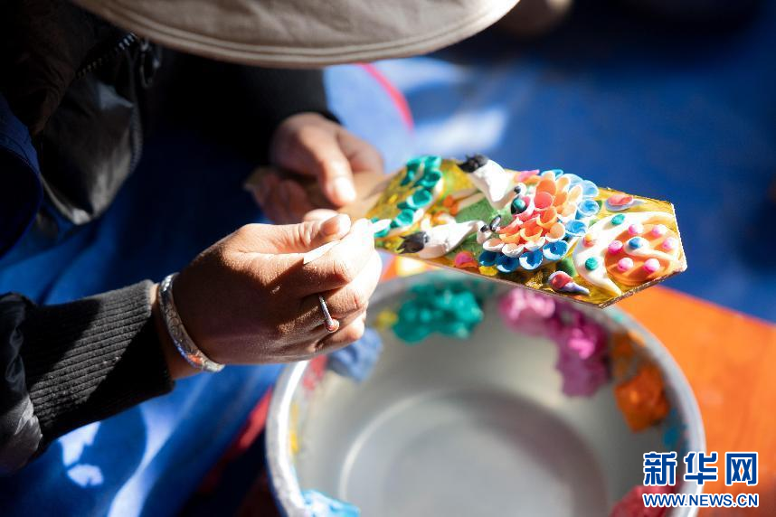 圖為西藏現(xiàn)代服務(wù)業(yè)技工學(xué)校的學(xué)員正在制作卡塞“德格”(1月29日攝)。新華網(wǎng)發(fā) 李騰 攝