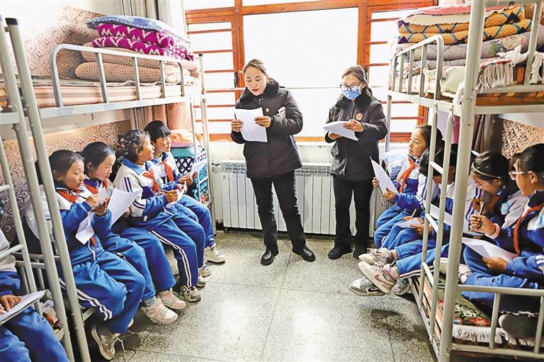 圖為措美縣人民法院工作人員在措美縣小學(xué)學(xué)生宿舍向?qū)W生普及法律知識。 記者 巴桑旺姆 攝