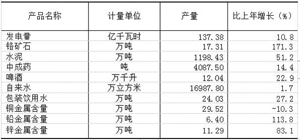 全年規(guī)模以上工業(yè)企業(yè)水泥產(chǎn)量1198.43萬(wàn)噸,比上年增長(zhǎng)51.2%;鉻礦石17.31萬(wàn)噸,增長(zhǎng)171.3%;中成藥(藏醫(yī)藥)4087.50噸,增長(zhǎng)14.4%;自來(lái)水16987.80萬(wàn)立方米,增長(zhǎng)1.7%;發(fā)電量137.38億千瓦時(shí),增長(zhǎng)10.8%;啤酒12.04萬(wàn)千升,增長(zhǎng)22.9%;包裝飲用水24.03萬(wàn)噸,增長(zhǎng)27.2%。