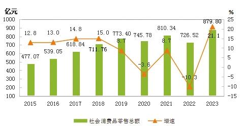 全年社會(huì)消費(fèi)品零售總額879.80億元,比上年增長(zhǎng)21.1%。按銷(xiāo)售單位所在地分,城鎮(zhèn)消費(fèi)品零售額716.67億元,增長(zhǎng)19.5%;鄉(xiāng)村消費(fèi)品零售額163.14億元,增長(zhǎng)28.8%。按消費(fèi)形態(tài)分,商品零售789.54億元,增長(zhǎng)19.9%;餐飲收入90.27億元,增長(zhǎng)32.4%。