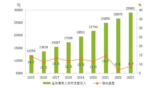 圖12 2015-2023年全體居民人均可支配收入及其增長(zhǎng)速度