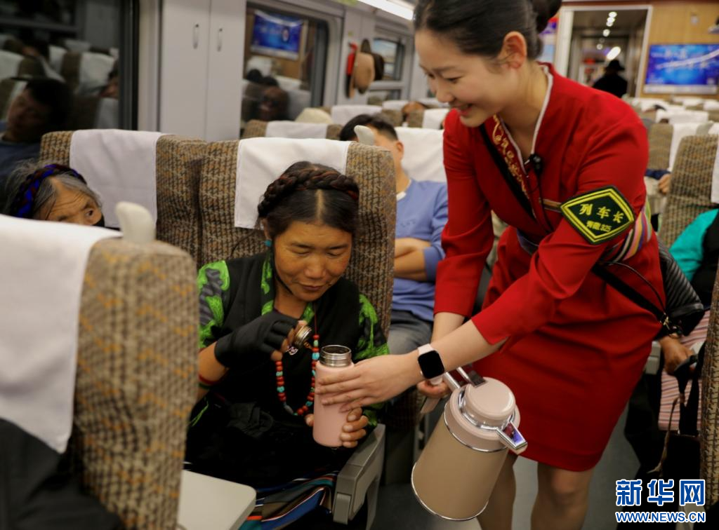 拉薩開往日喀則C885次列車長為旅客送開水。新華社發(fā)(馬生明 攝)