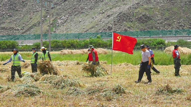 圖為拉薩市堆龍德慶區(qū)古榮護路大隊志愿服務(wù)分隊深入田間地頭,幫助農(nóng)民收割青稞。