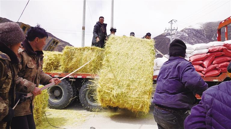 3月18日清晨,細(xì)碎的雪花如柳絮般輕柔飄落,墨竹工卡縣門巴鄉(xiāng)覆上了一層銀裝。門巴鄉(xiāng)巴爾卡村委會的院子里一片熱火朝天的景象,一袋袋飼草料和化肥整整齊齊地堆放在院子里,有的騎著摩托車,有的開著拖拉機(jī),大家的臉上都洋溢著幸福的笑容,滿心期待著物資發(fā)放。