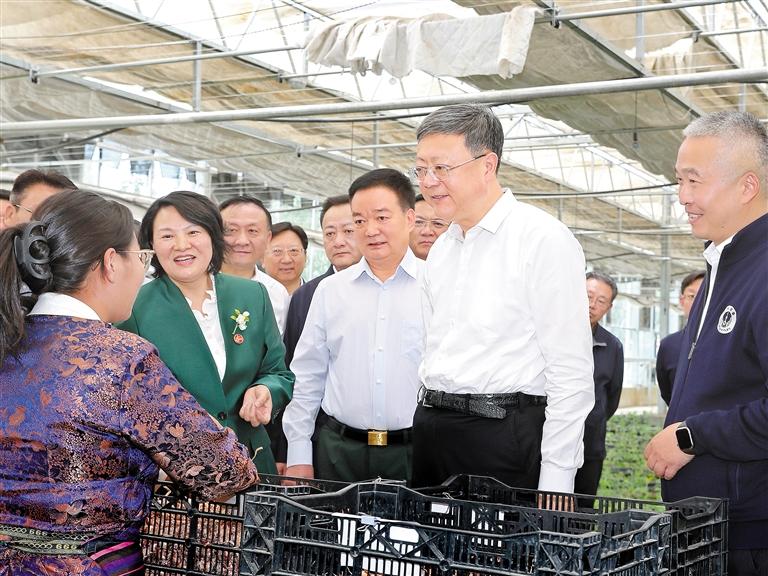 來到薩迦縣國家現(xiàn)代農(nóng)業(yè)產(chǎn)業(yè)園,溫室大棚內(nèi)作物長勢良好,一派生機盎然。近年來,在自治區(qū)黨委的大力推動下,上海市援藏力量主動作為,助力當?shù)卮罅Πl(fā)展高原特色農(nóng)業(yè),不斷拓寬群眾增收渠道。代表團走進產(chǎn)業(yè)園,聽取高原藜麥種源科技和產(chǎn)業(yè)發(fā)展、藏紅花種植技術創(chuàng)新和產(chǎn)業(yè)幫扶情況介紹,察看相關產(chǎn)品展示,與園區(qū)、企業(yè)負責人和科研團隊深入交流,就進一步推進高寒地區(qū)現(xiàn)代農(nóng)業(yè)全產(chǎn)業(yè)鏈高質(zhì)量發(fā)展進行討論。兩地同志表示,要立足雙方優(yōu)勢,把上海資金、管理、科技、人才等優(yōu)勢與西藏資源、區(qū)位等優(yōu)勢相結(jié)合,進一步做強特色產(chǎn)業(yè)、打響高原品牌,在以銷定產(chǎn)、產(chǎn)品推廣等方面開展深度合作,促進西藏優(yōu)質(zhì)資源變成好產(chǎn)品、走向大市場、賣出好價錢,有效帶動群眾就業(yè)增收,讓各族群眾錢包鼓起來、日子好起來。