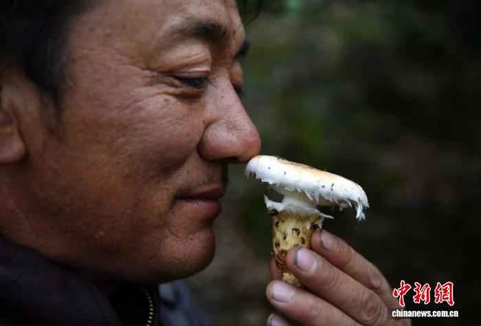 8月28日,扎稱在甘孜州鄉(xiāng)城縣色壩村細(xì)嗅松茸?!≈行律缬浾?王磊 攝