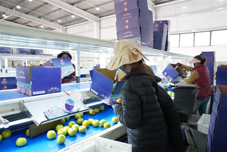 除了田間基地,蘋果產(chǎn)業(yè)鏈的延伸還為群眾帶來了更多就業(yè)選擇。位于洞嘎鎮(zhèn)巴基塘的智能化蘋果分揀車間于今年新建落成,車間內(nèi)流水線高效運轉(zhuǎn),工人們熟練地分揀、裝箱、搬運蘋果,空氣中的果香愈發(fā)濃郁。據(jù)車間負責人介紹,近期正忙著為電商平臺備貨,每天有16名工人負責打包1200余箱蘋果;因發(fā)貨繁忙,車間還額外雇傭了當?shù)嘏R時工,讓農(nóng)閑群眾多了一份收入。