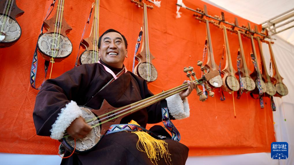 12月2日,洛桑曲扎在雅礱物資交流會現(xiàn)場彈奏扎念琴。(周昱龍 攝)