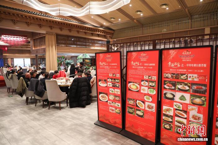 資料圖為2月16日農(nóng)歷除夕,青海省西寧市某餐廳吃年夜飯的顧客和“青海家宴”菜品介紹展板。馬銘言 攝