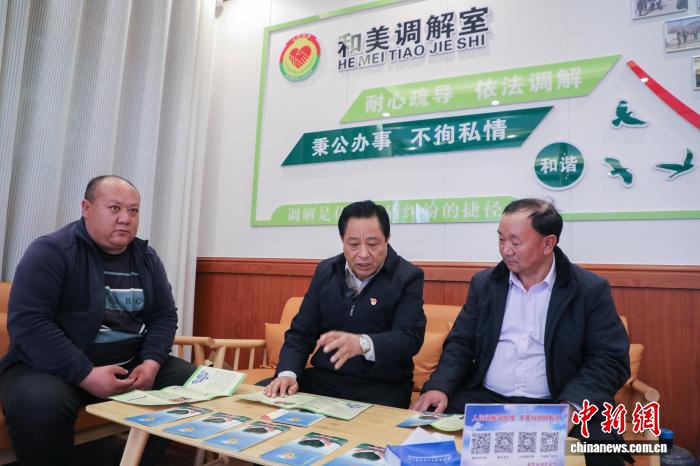 圖為馬世功(中)在“和美調(diào)解室”內(nèi)向村民普及法律知識。馬銘言 攝