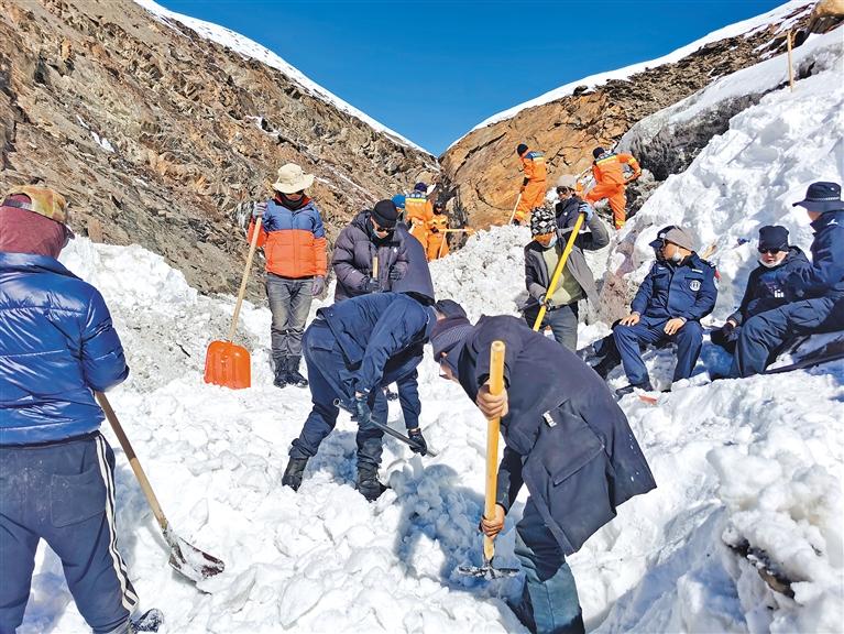 2022年10月底,洛扎縣突降大雪,農(nóng)牧民群眾的生命財(cái)產(chǎn)安全受到嚴(yán)重威脅,堅(jiān)增羅布又一次向組織申請(qǐng),主動(dòng)前往自己熟悉的色鄉(xiāng)曲吉麥放牧點(diǎn)參與緊急救援工作。他在山谷中鏟雪、碎冰、清理河道,連續(xù)奮戰(zhàn)12天,竭力尋找失蹤牧民,成功轉(zhuǎn)運(yùn)200多頭牦牛,最大限度維護(hù)了群眾生命財(cái)產(chǎn)安全。