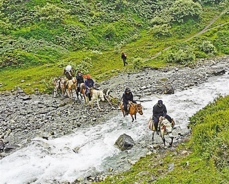 圖為貢當(dāng)邊境派出所民警騎馬護(hù)送村民及物資前往冬蟲夏草采挖區(qū)。西藏日?qǐng)?bào)記者 張宇 通訊員 季馨 攝