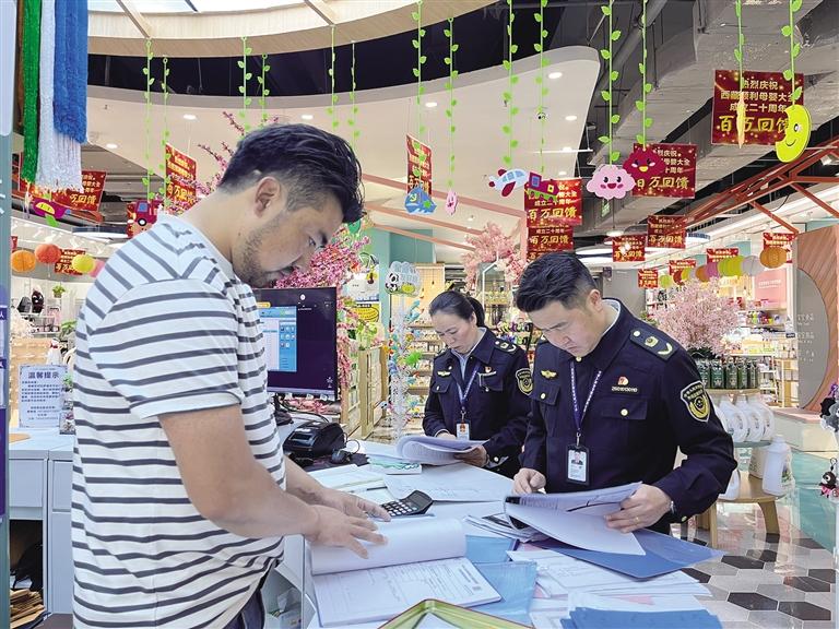 執(zhí)法人員對(duì)永輝超市(城關(guān)萬達(dá)廣場(chǎng)店)嬰幼兒配方乳粉進(jìn)行檢查。