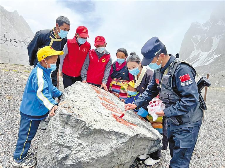 拉青拉山口是吉隆縣貢當(dāng)鄉(xiāng)境內(nèi)4座通外山口之一,也是中尼傳統(tǒng)邊貿(mào)通道,地形條件極其復(fù)雜。李錦一介紹,為增強(qiáng)黨員干部、邊境群眾和社會各界對國家安全、邊境穩(wěn)定的關(guān)心關(guān)注,貢當(dāng)鄉(xiāng)創(chuàng)新思路開展“國旗插在最前沿 我為祖國守邊關(guān)”系列活動?;顒佣ㄆ谘埲温毟刹?、返鄉(xiāng)探親干部、休假返鄉(xiāng)軍人、節(jié)假日在鄉(xiāng)學(xué)生等一同參與界樁描紅、同升國旗、邊境巡邏等各類活動,讓更多人參與到守護(hù)邊疆的行動中來。