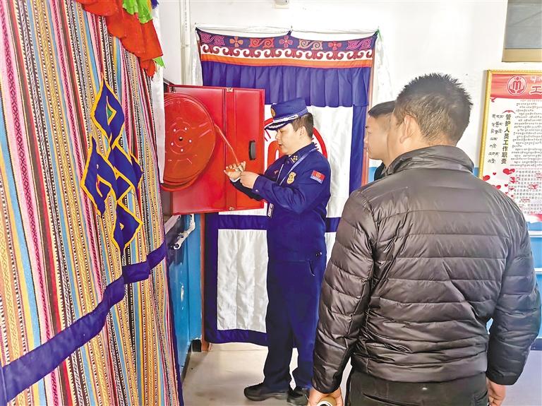 林芝市工布江達(dá)縣消防救援大隊(duì)宣傳人員檢查養(yǎng)老機(jī)構(gòu)的消防設(shè)施設(shè)備。 通訊員 才旺多吉 攝