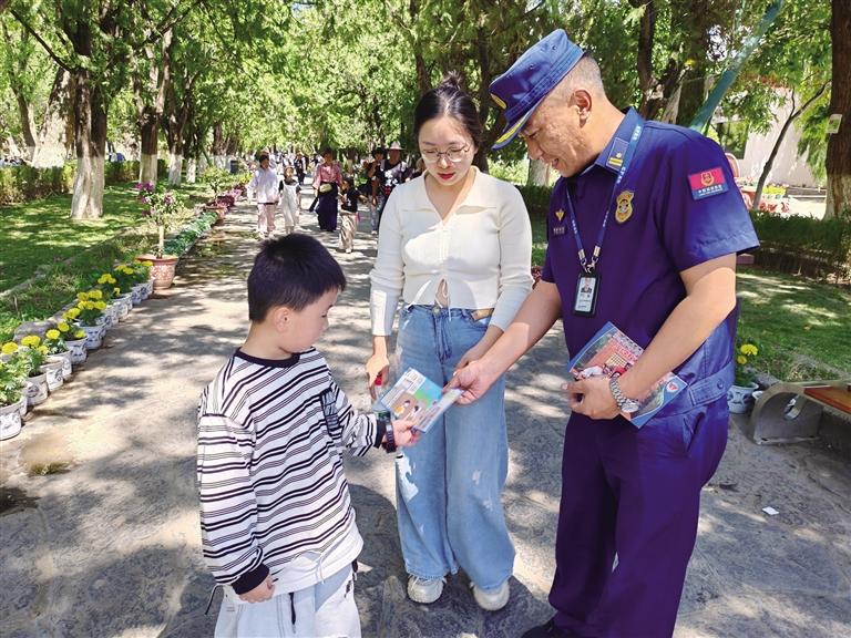 講師團成員正在為市民發(fā)放消防宣傳手冊。圖由拉薩市消防救援支隊提供