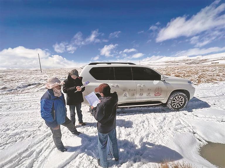 在雙湖縣,人民法院車載科技流動法庭日行千里,加強與生態(tài)管護站、行政村協(xié)作,構(gòu)建“庭·站聯(lián)合”生態(tài)預(yù)警網(wǎng)格,及時發(fā)布司法保護令和環(huán)保倡議書。在安多縣,法院干警翻越唐古拉山,深入森布日生態(tài)搬遷安置點,通過“加強聯(lián)絡(luò)暢渠道”工作法,與群眾促膝長談,傾聽民意;雁石坪人民法庭干警還主動加入格拉丹東“長江第一滴水”志愿巡護隊,聘請當?shù)攸h員志愿巡護隊員擔任生態(tài)法治巡護聯(lián)絡(luò)員,凝聚保護青藏高原生態(tài)的法治合力。