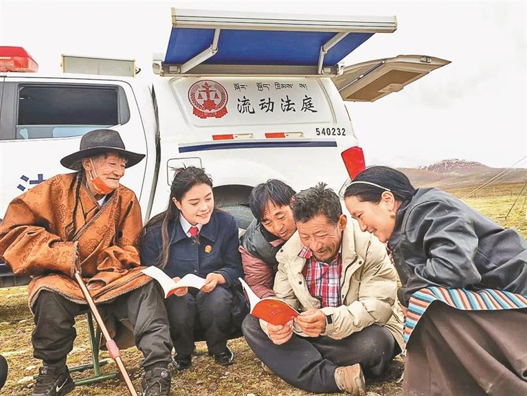 安多縣人民法院雁石坪法庭干警和流動法庭來到牧區(qū)草場,進行巡回普法。