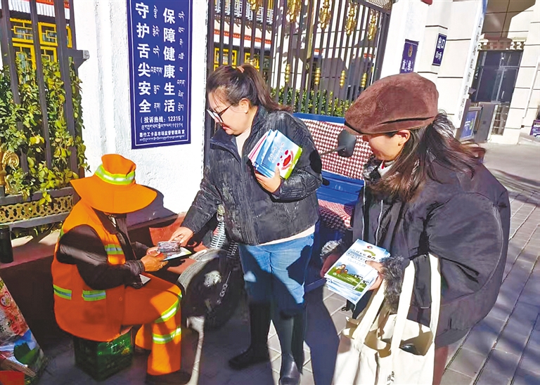 墨竹工卡縣群團工作部婦聯(lián)工作人員向環(huán)衛(wèi)工人發(fā)放反家庭暴力宣傳手冊。