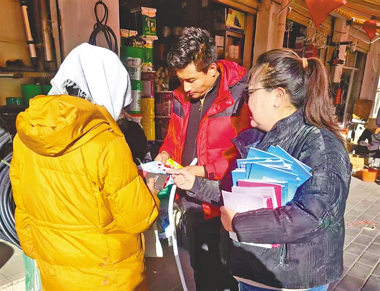 墨竹工卡縣群團工作部婦聯(lián)工作人員走進商戶發(fā)放反家庭暴力宣傳手冊。記者 格桑倫珠 攝