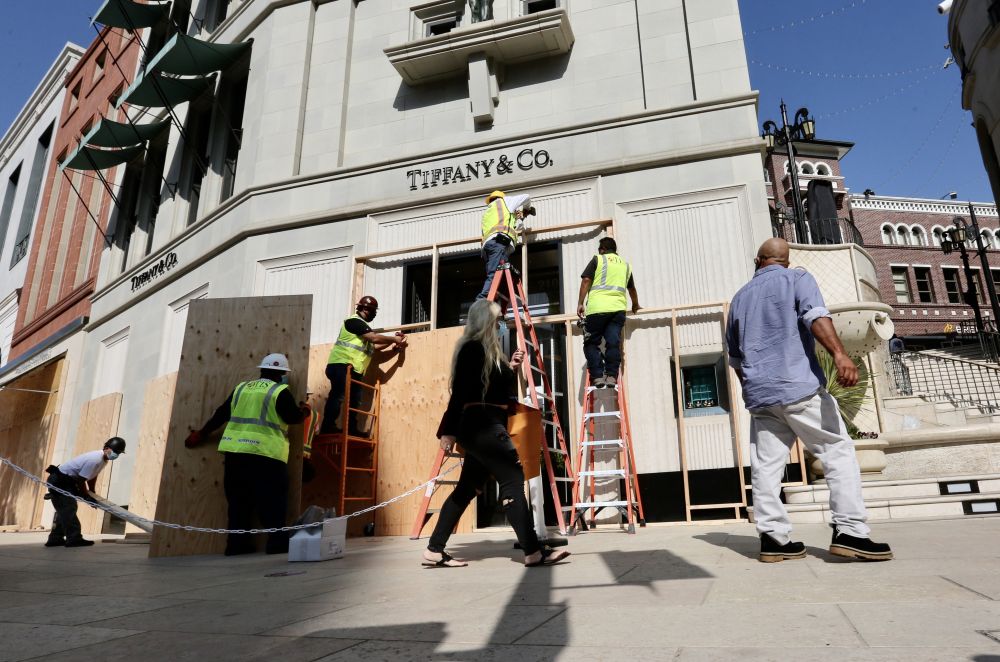 2020年11月2日,美國洛杉磯縣貝弗利山市商業(yè)區(qū)的商家將店鋪門窗封上。為應對當時美國大選可能出現的抗議或騷亂,貝弗利山市不少商業(yè)區(qū)加強防護和安保。 新華社發(fā)