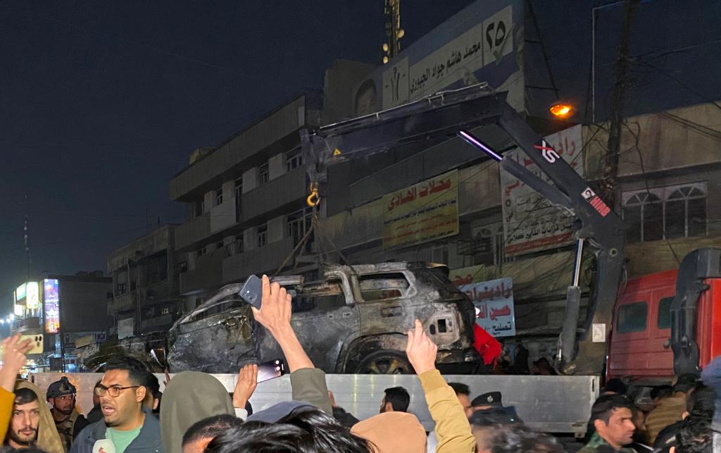 2024年2月7日,在伊拉克首都巴格達(dá),民防部門轉(zhuǎn)移遭無(wú)人機(jī)襲擊的車輛。新華社發(fā)(哈利勒·達(dá)伍德攝)