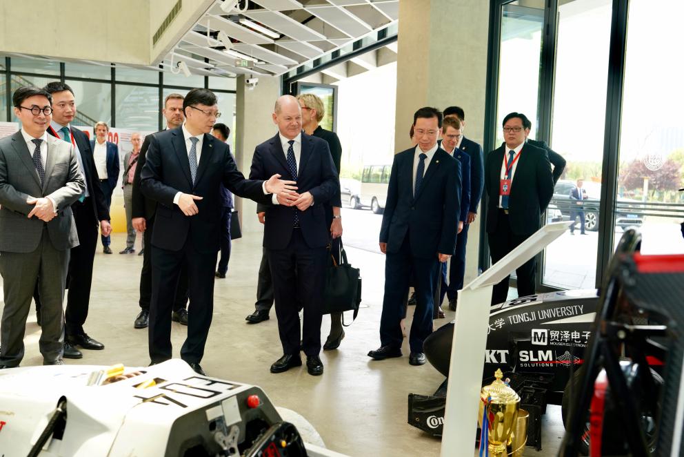 4月15日,德國總理朔爾茨(前排左三)在上海參觀同濟(jì)大學(xué)科研創(chuàng)新作品。新華社記者高峰 攝