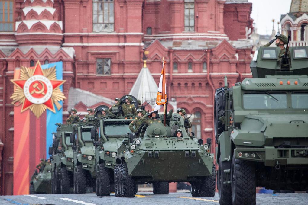 5月9日,在俄羅斯首都莫斯科,軍車編隊(duì)駛過(guò)紅場(chǎng)。新華社記者曹陽(yáng)攝