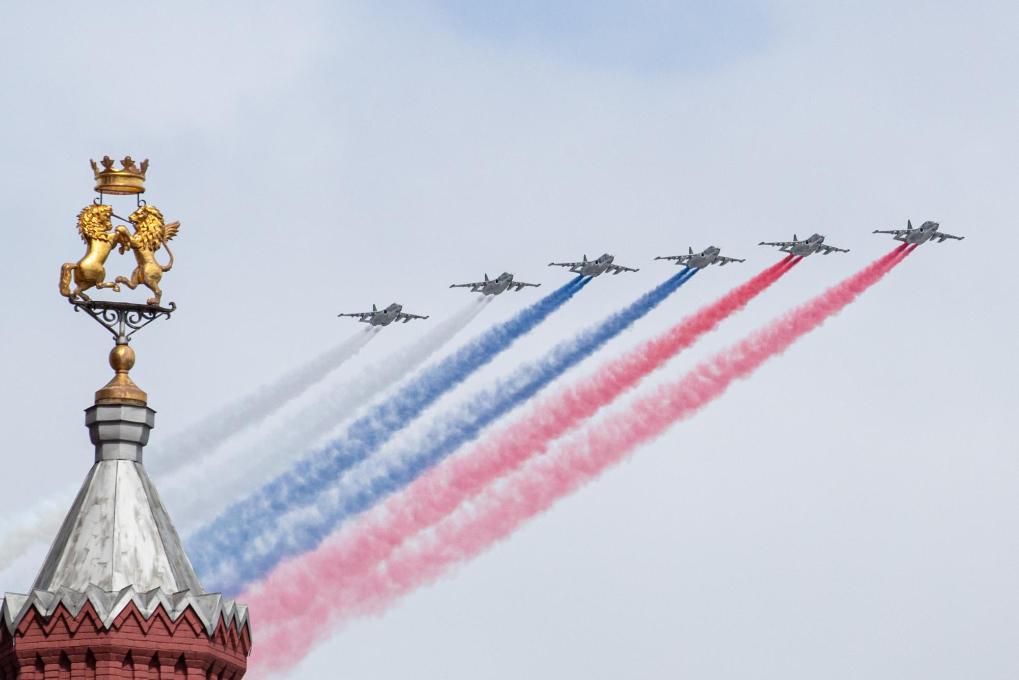 5月9日,在俄羅斯首都莫斯科,蘇-25攻擊機(jī)編隊(duì)在紅場(chǎng)上空飛過(guò)。新華社記者白雪騏攝