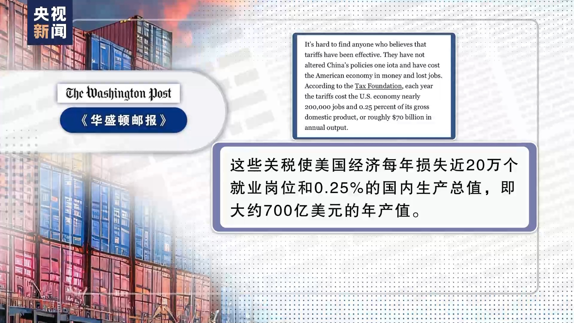 另據(jù)美國《華盛頓郵報》4月援引美國稅務基金會的數(shù)據(jù),這些關(guān)稅使美國經(jīng)濟每年損失近20萬個就業(yè)崗位和0.25%的國內(nèi)生產(chǎn)總值,即大約700億美元的年產(chǎn)值。