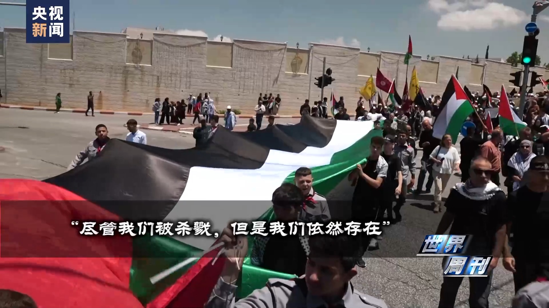一場支援巴勒斯坦人“災(zāi)難日”的抗議活動(dòng)正在進(jìn)行。人們高舉“反種族滅絕”“解放巴勒斯坦人”等標(biāo)語。