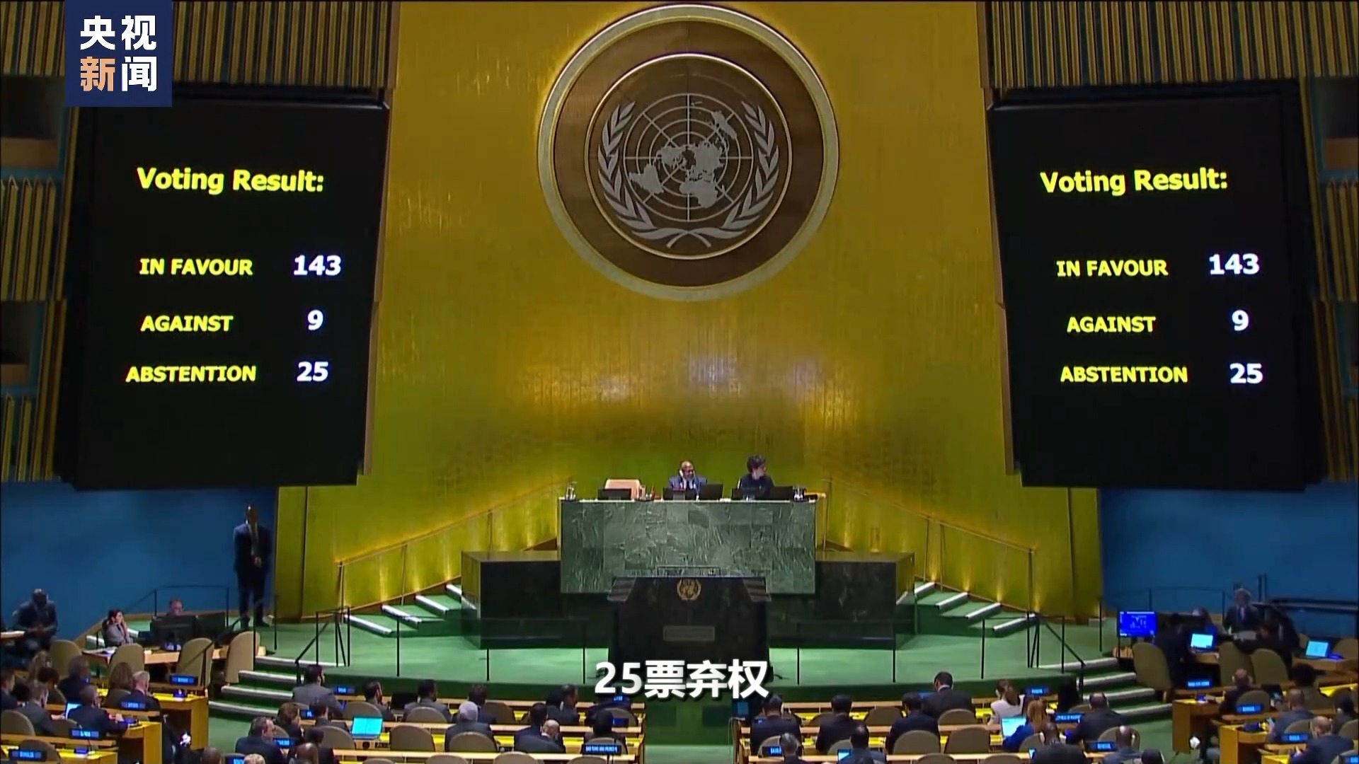 聯(lián)合國大會(huì)主席 丹尼斯·弗朗西斯:表決結(jié)果如下:143票贊成,9票反對(duì),25票棄權(quán)。