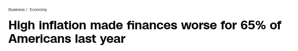 美聯(lián)儲(chǔ)近日發(fā)布的《2023年美國(guó)家庭經(jīng)濟(jì)狀況報(bào)告》(Economic Well-Being of US Households)顯示,65%的美國(guó)家庭的財(cái)務(wù)狀況因通脹而惡化,其中19%的人認(rèn)為財(cái)務(wù)狀況“嚴(yán)重惡化”。