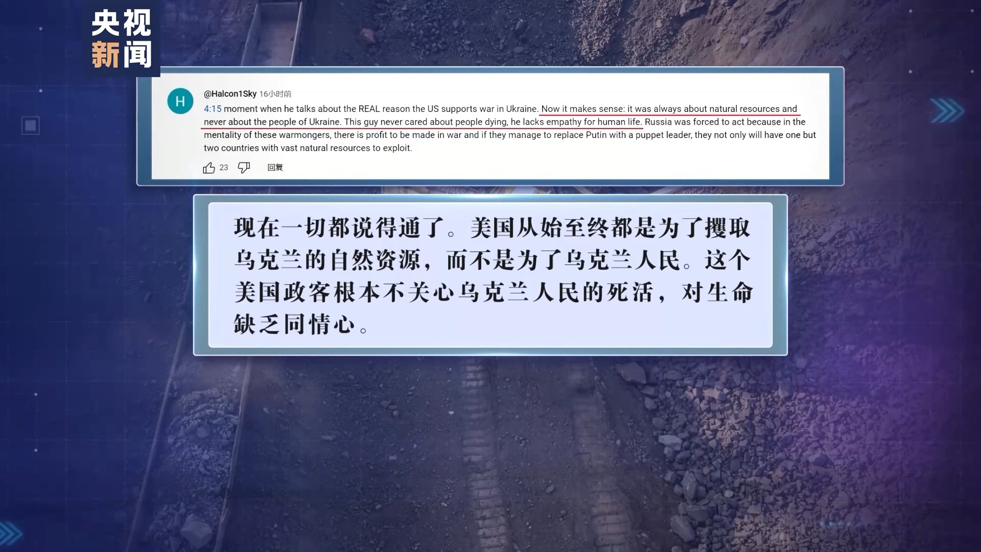 網(wǎng)友:現(xiàn)在一切都說得通了。美國從始至終都是為了攫取烏克蘭的自然資源,而不是為了烏克蘭人民。這個(gè)美國政客根本不關(guān)心烏克蘭人民的死活,對(duì)生命缺乏同情心。