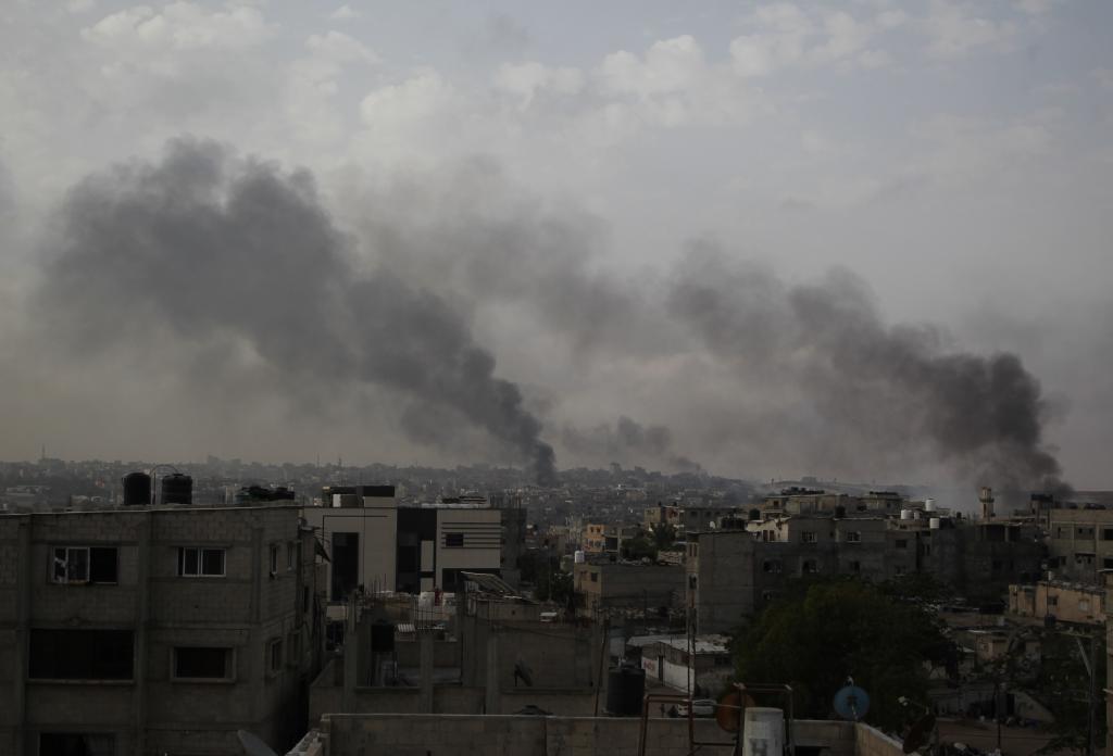 以色列陸軍坦克5月28日開進加沙地帶南部城市拉法市中心。圖為拉法當天在以軍密集轟炸期間升起濃煙。新華社發(fā)(哈立德·奧馬爾攝)