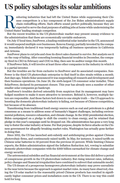 原標(biāo)題:US policy sabotages its solar ambitions