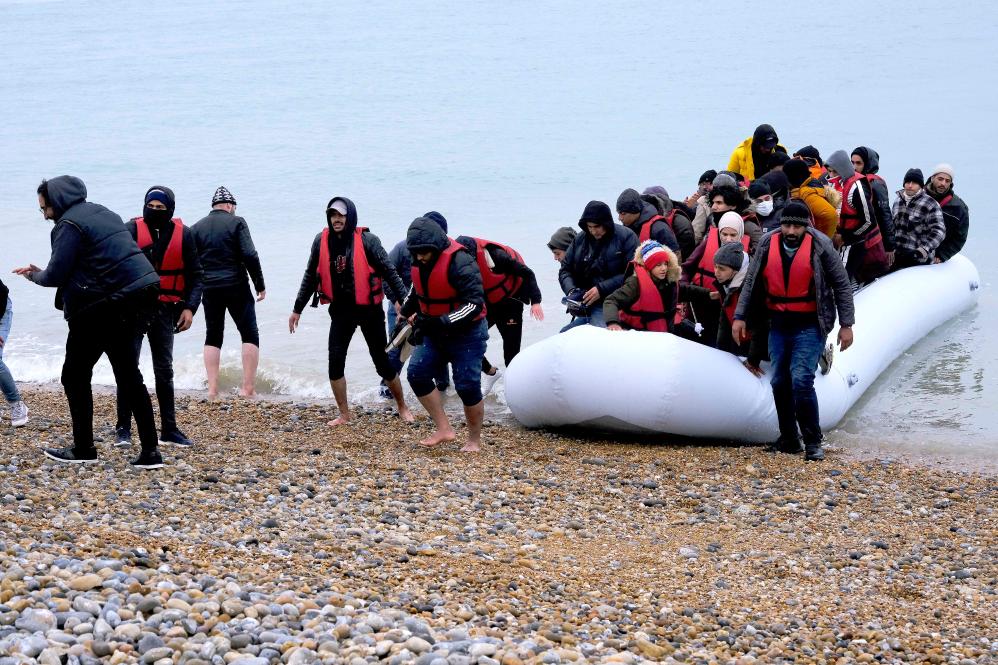 圖為2021年11月24日,移民乘船抵達(dá)英國鄧杰內(nèi)斯角海岸。(新華社發(fā),史蒂夫·芬恩攝)