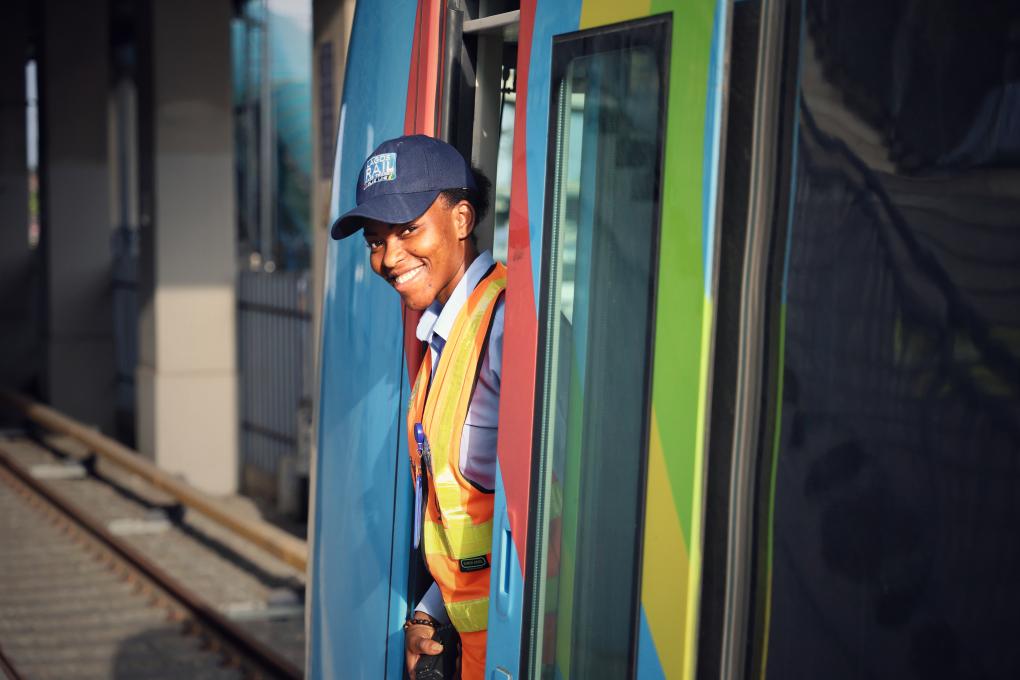 6月12日,在尼日利亞拉各斯,拉各斯輕軌藍線項目動車組列車司機組長伊莎貝拉·亞當(dāng)斯·伊斯拉埃爾與列車合影。新華社發(fā),中土集團尼日利亞有限公司供圖