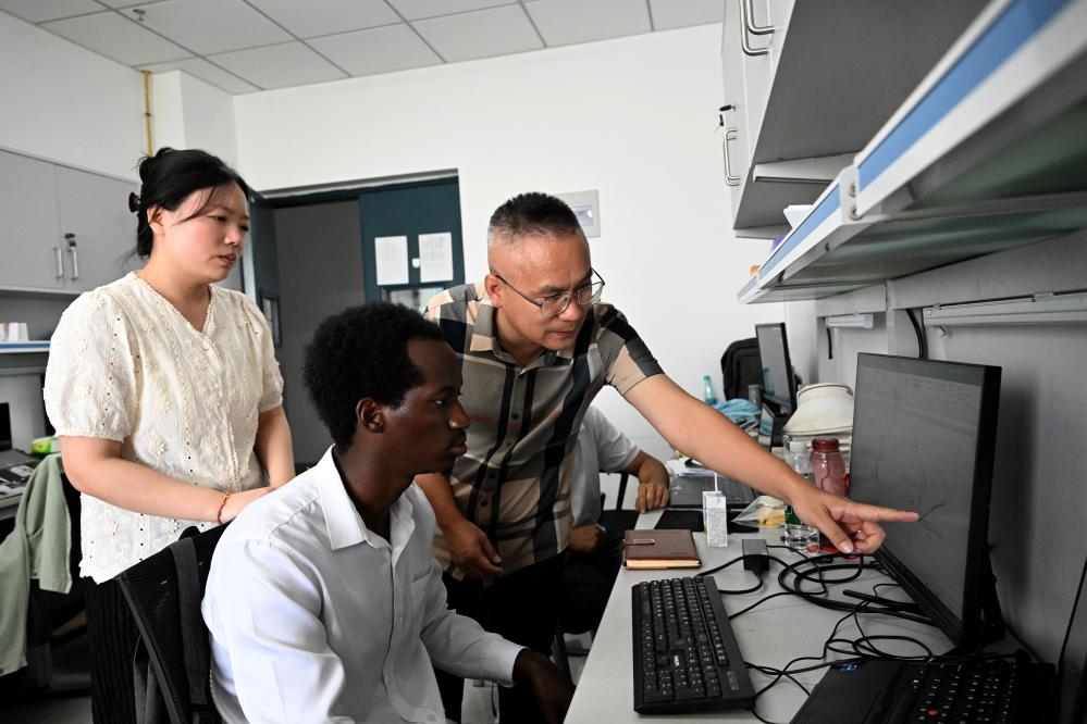8月13日,在位于安徽省合肥市的安徽農(nóng)業(yè)大學(xué),中方導(dǎo)師在指導(dǎo)一名盧旺達學(xué)生和其他學(xué)生學(xué)習(xí)。新華社記者黃博涵攝